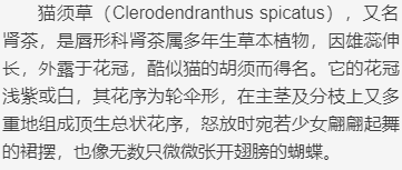 点击阅读原文,查看更多 距离第八届开幕 还有39天 图1 古埃及猫首人身的女神芭丝特(Bastet),象征家庭温暖与喜乐,备受古埃及人喜爱 (图片来源:wikipedia-Gunawan Kartapranata) 01 图2 猫薄荷(图片来源:中国植物图像数据库) 02 图3 猫爪草的花(图片来源:徐文斌拍摄) 图4 猫爪草的肉质根(图片来源:中国植物图像数据库) 图5 猫爪(图片来源:wikipedia- cloudzilla) 03 图6 猫眼草(图片来源:中国植物图像数据库) 图7 猫眼(图片来源:stockvault.net,CC0共享) 04 图8 猫须草,雄蕊与猫须很相似,猫须见上图 (图片来源:张莉俊拍摄) 05 图9 猫尾草(图片来源:中国植物图像数据库) 图10 猫尾(图片来源:rawpixel) 06 图11 猫尾木(图片来源:中国植物图像数据库) 参考文献: [1] “猫毒品”——猫薄荷与猫趣谈.武汉植物园花博士自然百科. [2] 猫爪草研究概况与展望.中国野生植物资源. [3] 猫尾草栽培与利用.种植 以上信息均整理自“中国科普博览(kepubolan)”,仅用于公益传播,如有侵权,请联系我们!