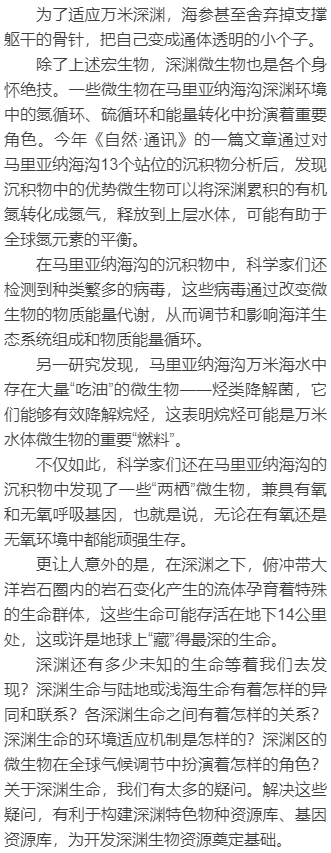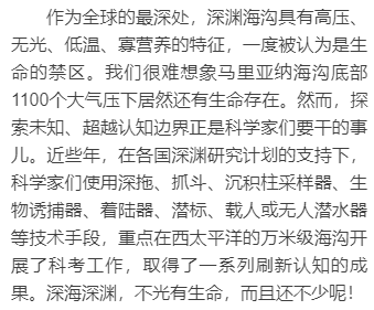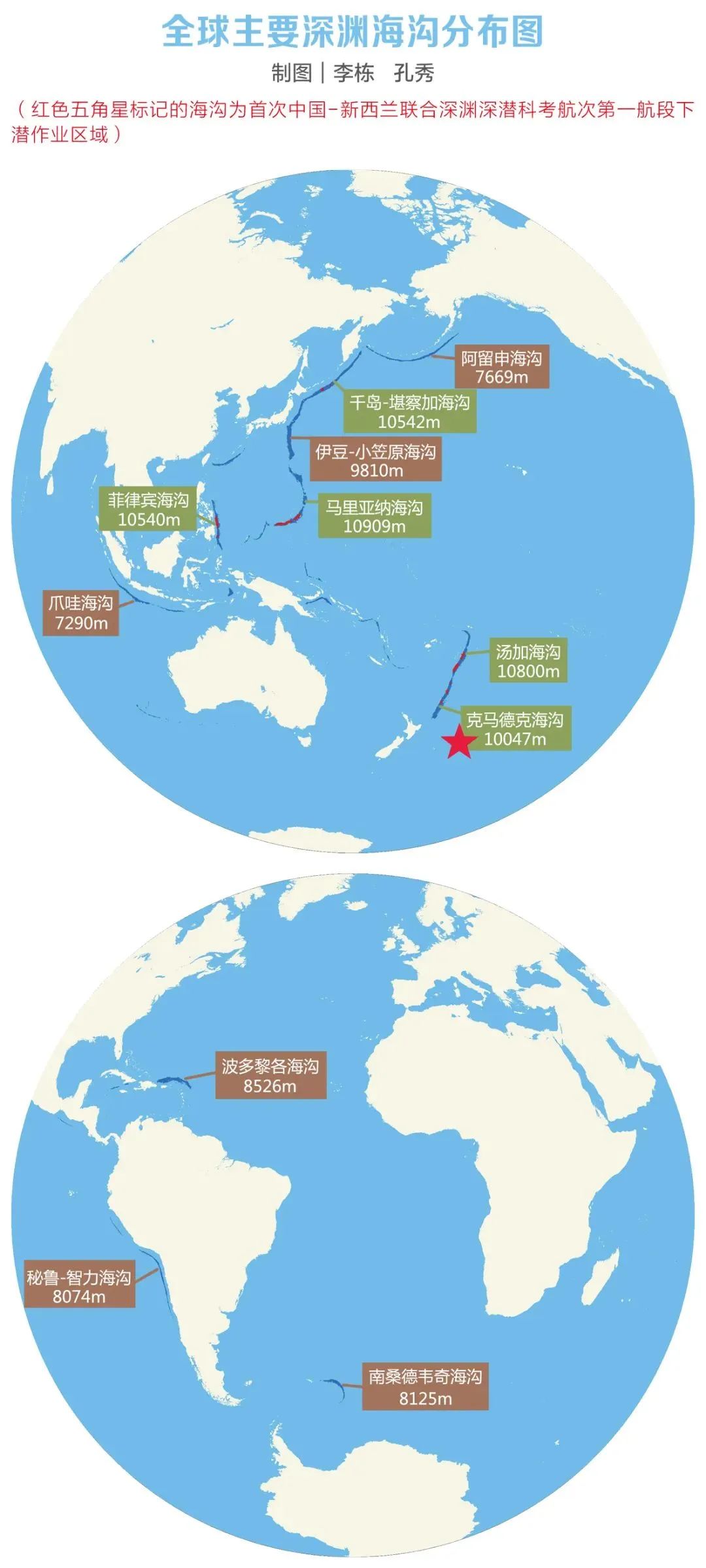 点击蓝字 关注我们 首次中国-新西兰联合深渊深潜科考航次完成克马德克海沟第一航段科考任务 相由心生——板块构造学说 海这一辈子——威尔逊旋回 没有规律的规律——万物有道 触摸地球最深处—— 深渊海沟 全球主要深渊海沟分布图 (红色五角星标记的海沟为首次中国-新西兰联合深渊深潜科考航次第一航段下潜区域) 俯冲工厂——俯冲带 颠覆认知——生命起源的重新考量 黑烟囱、海葵、虾,西南印度洋热液区,深度3312米 摄影/“深海勇士”号载人潜水器 换一种活法——深渊生命 琵琶鱼, 克马德克海沟, 深度5736米 摄影/“奋斗者”号载人潜水器 稀有深海海星,克马德克海沟,深度6700米 摄影/“奋斗者”号载人潜水器 鼬鳚鳗鱼,克马德克海沟,深度6500米 摄影/“奋斗者”号载人潜水器 一块坚硬的石头成为海星、海葵、小珊瑚、海绵和海鞘共同的家,克马德克海沟,深度6124米 摄影/“奋斗者”号载人潜水器 海星,马里亚纳海沟,深度9580米 海葵,马里亚纳海沟,深度9254米 多毛类,马里亚纳海沟,深度7120米 海绵,西菲律宾海盆,深度7464米 海参,马里亚纳海沟,深度10812米 海葵,马里亚纳海沟,深度9000米 一排海葵(岩石下),马里亚纳海沟,深度9347米 摄影/“奋斗者”号载人潜水器 八仙过海,各显神通——身怀绝技的深渊生命 狮子鱼群,西菲律宾海盆,深度7731米 钩虾,马里亚纳海沟,深度10900米 摄影/“奋斗者”号载人潜水器 最后一方“净土”的丢失——深渊污染 在深渊海沟发现的垃圾 摄影/“奋斗者”号载人潜水器 研究地外海洋的试验场——深渊海沟 深渊研究利器——载人潜水器 “奋斗者”名片 基本参数: 母船:探索一号 最大工作深度: 11000m 尺寸:长10.26m,宽3.17m,高4.4m 重量:36t 有效载荷: 200kg(空气中) 万米深海下潜时间: 12h 可载人数:3人 水下最大航速:2.5节 载人舱内径:1.8m 观察窗数量:3个 平均上浮、下潜速率: 60 m/min “奋斗者”号载人潜水器是国家重点研发计划“深海关键技术与装备”重点专项支持研制的深海装备,是我国首台具备全球海域载人进入能力的重要装备,也是首台拥有自主知识产权的全海深载人潜水器。2020年11月,“奋斗者”号完成万米海试,创造了10909米的中国载人深潜纪录,中科院深海所积极部署实施全球深渊深潜探索计划(Global Trench Exploration and Dive Program,缩写Global TREnD)。中国-新西兰联合深渊深潜科考航次第一航段科考任务在克马德克海沟的圆满完成,代表Global TREnD计划迈出了坚实的步伐。在未来,科考队将继续发挥“奋斗者”号的深度和技术优势,将我国深渊深潜科考扩展到全球多个典型海沟,展开多国联合的、系统的深渊地质、生命和环境科学多学科综合深潜考察。 有了这样的利器,相信不久的将来,深渊海沟的神秘面纱将被一一揭开。 信息来源: 本文转载自 孔秀.海沟的前世今生——为什么深海研究要瞄准海沟?[EB/OL].“海洋世界文化无限”公众号,2022-12-16. 以上信息均整理自互联网,仅用于公益传播,如有侵权,请联系我们!
