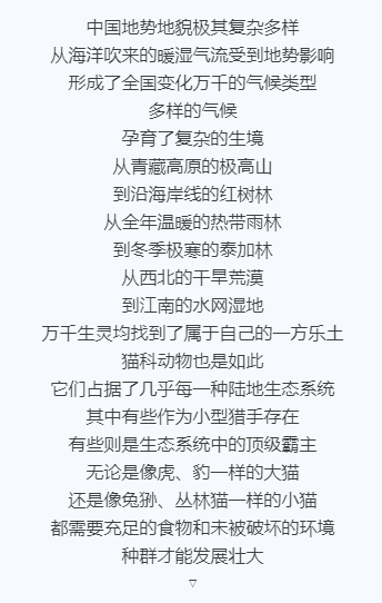 点击蓝字 关注我们 △虎的生存需要大量猎物和大片栖息地,图为雌性东北虎。图源:珲春市野生动植物保护协会 李冬伟 01 高原精灵 △雪豹主要栖息在林线以上、雪线以下的高山带和亚高山带。图源:山水自然保护中心 △雪豹——高山之王。图源:山水自然保护中心 △以岩羊为代表的野生山羊是雪豹主要的食物来源。图源:山水自然保护中心 △荒漠猫并不喜欢荒漠,更加偏好灌草丛丰富的浅山区。图源:山水自然保护中心 02 山地猎手 △你能找到草丛中隐身的云豹吗?图源:猫盟、西双版纳易武州级自然保护区、云南西双版纳国家级自然保护区科研所 03 荒漠游侠 △塔克拉玛干沙漠,生命的禁区。 △珍贵的亚洲野猫记录照。图源:张晖 △萌萌的兔狲。图源:甘肃祁连山国家级自然保护区、北京大学、猫盟 △网红打架。图源:梁海宏 以上信息均整理自“中国国家地理BOOK”,仅用于公益传播,如有侵权,请联系我们!