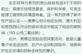 点击蓝字 关注我们 使用从海洋回收的塑料制作芭比 芭比爱海洋系列有三个娃娃|Mattel.com 灵长类动物学家珍·古道尔博士与以自己为原型的芭比娃娃合影|PA Media - Jane Goodall Productions/Mattel 2022 年年度生态职业领导力芭比,包括保护地球和促进可持续发展的四个形象|Mattel.com 可持续材料玩具是趋势 费雪积木玩具|Mattel.com 100% 可回收的UNO纸牌|Mattel.com 这样的套装玩具希望通过游戏,向儿童传授绿色和可持续发展的知识,包括垃圾分类、使用电动交通工具、保护蜜蜂和选择可再生能源 |Mattel.com 为什么要做可持续材料的玩具 被遗弃的娃娃|Faldrian/Wikimedia Commons 海洋塑料垃圾 |图虫创意 美泰的Playback计划通过回收旧玩具制作未来的新产品,或将这些材料转化为能源。 参考文献 [1]https://corporate.mattel.com/news/mattel-launches-barbie-loves-the-ocean-its-first-fashion-doll-collection-made-from-recycled-ocean-bound-plastic [2]https://corporate.mattel.com/news/the-future-of-pink-is-green-barbie-introduces-new-dr-jane-goodall-and-eco-leadership-team-certified-carbonneutral-dolls-made-from-recycled-ocean-bound-plastic [3]https://www.tenereteam.com/blogs/how-mattels-barbie-and-their-other-brands-charge-toward-sustainability/ [4]https://barbie.fandom.com/wiki/4ocean_x_Barbie_Limited_Edition_Beaded_Bracelet#Closed-Loop%20Program [5]https://www.eco-business.com/opinion/why-toy-makers-are-switching-to-safe-and-sustainable-plastics/ [6]https://www.usatoday.com/story/money/reviewed/2021/12/01/sustainable-and-earth-friendly-toy-brands-kids/8826901002/ 以上信息均整理自互联网,仅用于公益传播,如有侵权,请联系我们!