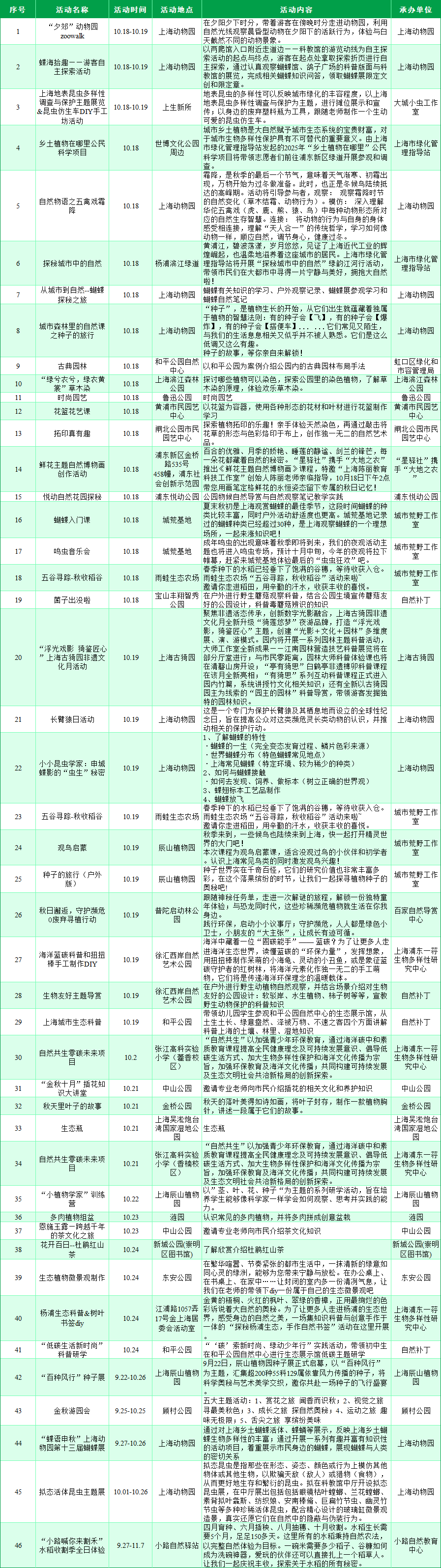 在本届上海国际自然保护周期间及其前后,本市各个公园、中小学、自然教育机构等将开展内容丰富、形式多样的系列科普活动40多场。欢迎广大市民朋友们与我们一起走进自然,感受自然美学,切身体验上海公园城市建设成果。