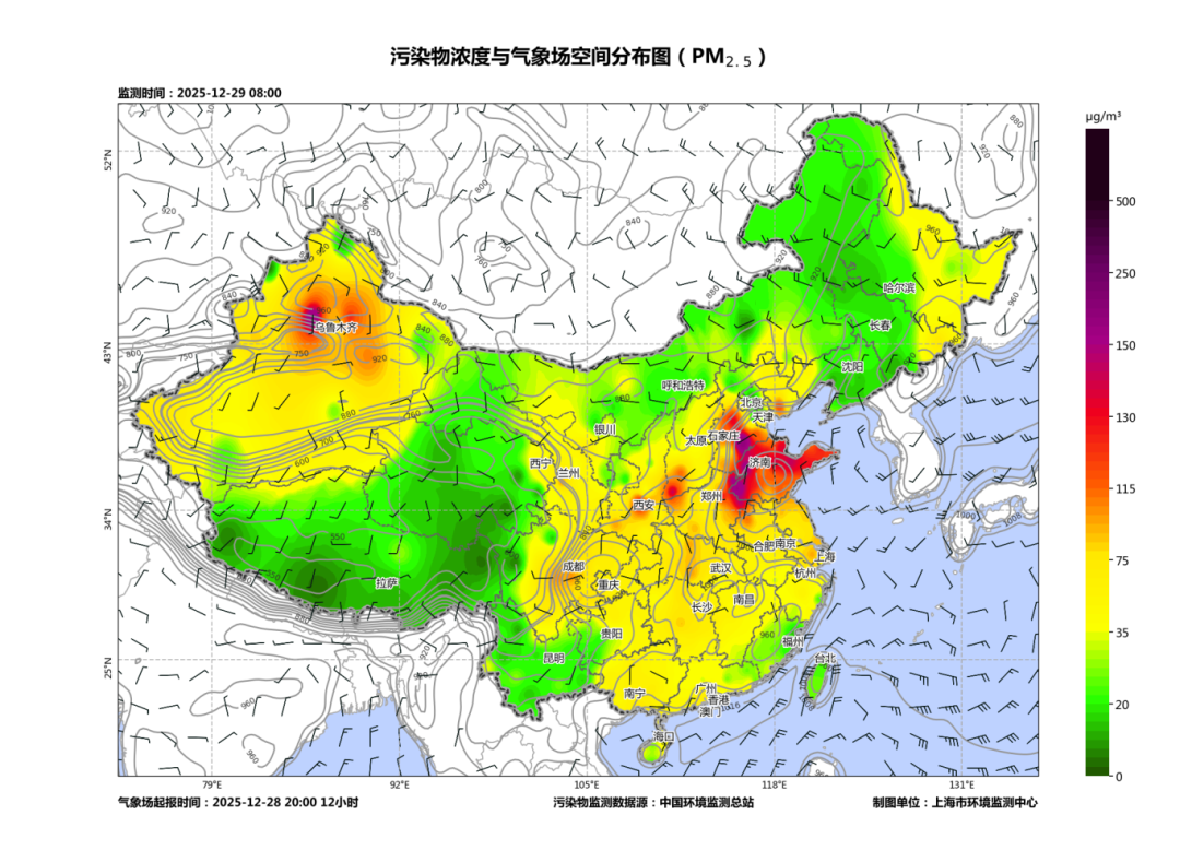 受不利气象条件影响,29日8时,河北南部、河南东部和山东大部出现PM2.5中度至重度污染,本市主导西南风0~1m/s,空气质量良。