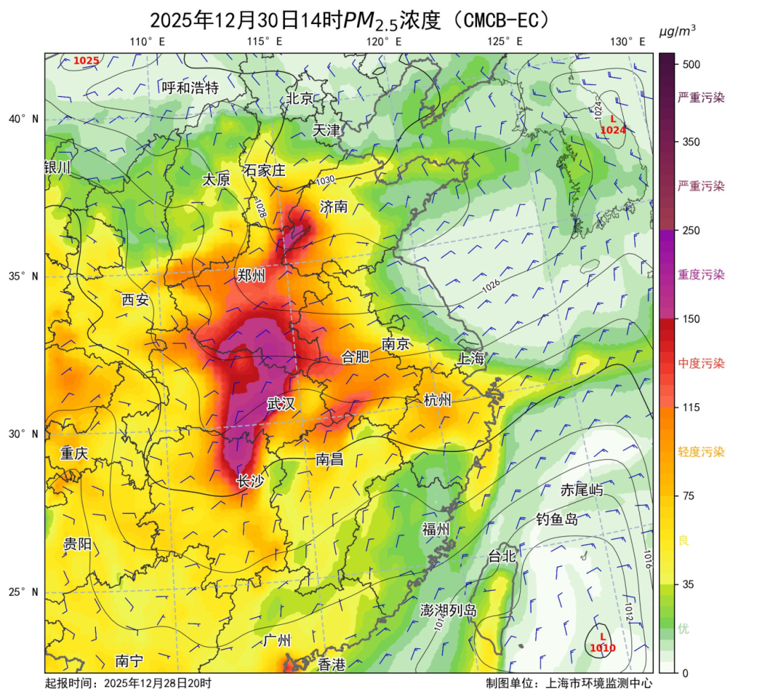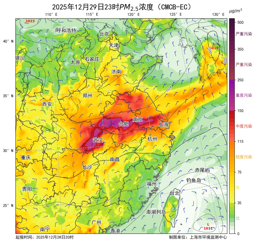 根据最新资料,预计29日白天,本市西南风顺转东北风1~2m/s,受局地累积叠加东北通道污染输送影响,PM2.5浓度逐渐上升,预计29日夜间达到峰值,出现轻度至中度污染过程;30日上午,主导东北风2~3m/s,PM2.5浓度逐渐下降,以良至轻度污染为主,下午风速增大,污染过程结束,空气质量好转为优良水平。