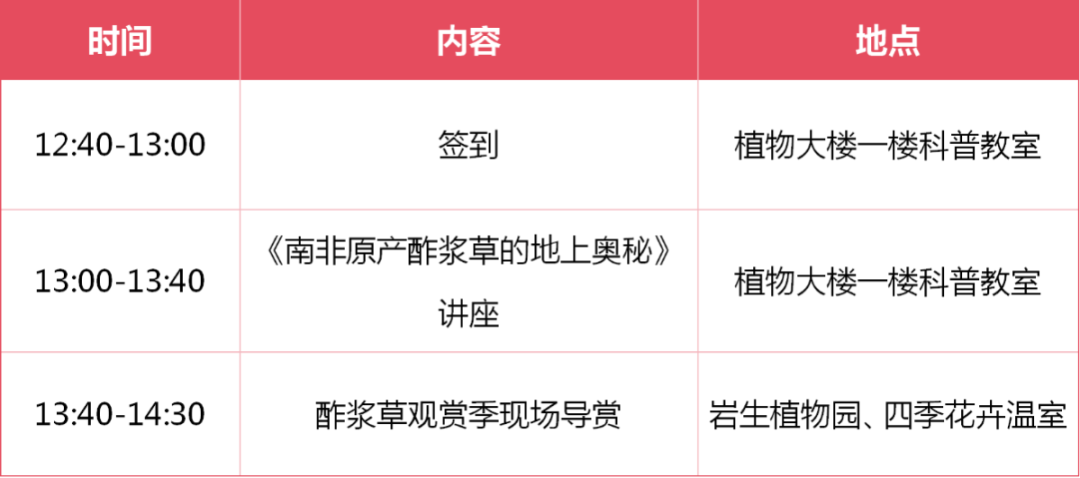 2026年1月10日 周六 13:00-14:30 植物大楼一楼科普教室、 北区岩生植物园、南区四季花卉温室 20人 活动免费 王满泽,资深球根植物爱好者,主要关注类型为南非的球根类植物,有十余年的球根植物种植经验,对南非各种球根植物的分类学有一定了解。 点击文末“阅读原文”关注上海植物园官方服务号进行报名,首次报名需完善个人信息。请根据提示填写姓名、年龄、手机等信息,系统将自动根据报名成功顺序录取,满额为止。请于报名前确认是否有时间参加活动,一旦报名成功请准时参加。无故缺席、外带未报名人员将扣除诚信积分20分(诚信积分初始值为100分,低于60分将不得参与主办方举办的活动)。如无法参加,请在服务号菜单“活动报名”中提前24小时以上取消报名。 1、请报名成功的参与者自行前往上海植物园植物大楼集合签到。 2、参加活动的儿童须具备基本的理解能力和自控能力,报名前请征询儿童的参加意愿。 3、上海植物园拥有活动期间拍摄之影像资料的所有权与使用权。 Q:怎样知道自己是否报名成功? A:进入上海植物园服务号,选择菜单“活动报名”-“我的活动”进行查看。 Q:临时有事去不了怎么办? A:请在服务号菜单“活动报名”中提前24小时以上取消报名。活动开始前24小时内无法取消活动,可自行转让名额。无故缺席将扣除诚信积分20分(诚信积分初始值为100分,低于60分将不得参与主办方举办的活动)。 Q:为什么我在签到的地方找不到工作人员? A:负责签到的工作人员会在活动前15分钟至活动开始后15分钟在签到处等待,敬请做好时间规划,避免迟到影响活动的顺畅进行。 图:资料图 审核:李敏 上海植物园1号门(龙吴路1111号)开放时间为11月~次年4月7:00-17:00,5月~10月7:00-18:00;3号门(百色路940号)、4号门(罗城路151号)开放时间为11月~次年4月6:00-17:00,5月~10月6:00-18:00。残疾车辆统一从1号门进出。 团队请至少提前3天联系,于工作日8:30-16:30拨打021-54363369*1017。详见官方网站。 为确保市民游客能拥有安全舒适的游园环境,请大家错峰出行,若达到承载量上限园方将采取相应大客流预案。因室内专类园瞬时承载量有限,游客量高峰时段,谢绝开展聚集类非游园活动。 公共交通: 【一号门(龙吴路1111号)】 龙吴路百色路站:56、714、720、770、824、956、958、178、上奉专线 【三号门(百色路940号)】 百色路龙川北路站:824、720、973 轨道交通3号线石龙路站,出站后过天桥,沿东泉路步行至罗城路。 自驾车: 因上海植物园2号门停车场已经拆除,周边停车资源紧张,请市民朋友尽量选择公共交通,绿色出行。 来源:以上内容来自网络,仅用于公益传播,如有版权问题请与我们联系转载自“上海植物园”