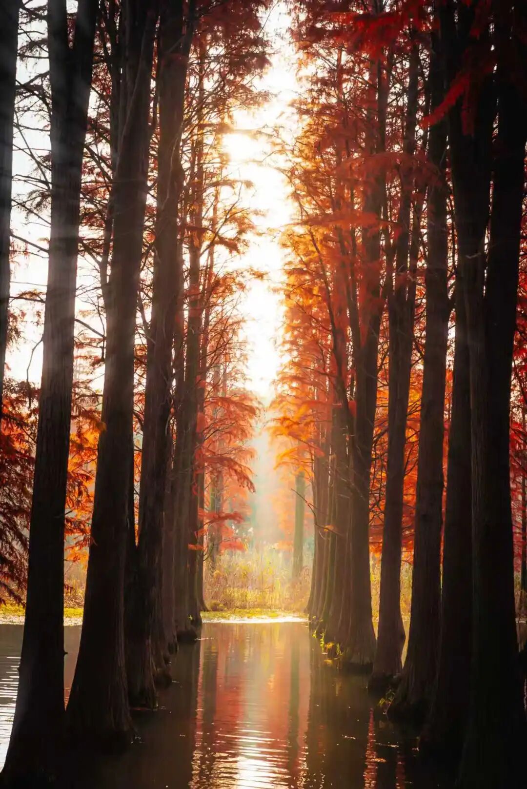 阳光透过云层洒在水面,光影交错间,水杉倒影灵动又深邃。漫步在木质栈道上,仿佛闯入红色隧道,一步一景,处处是惊喜。