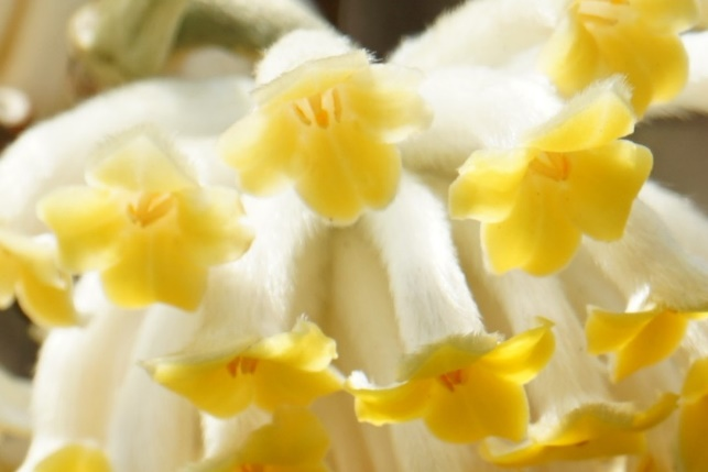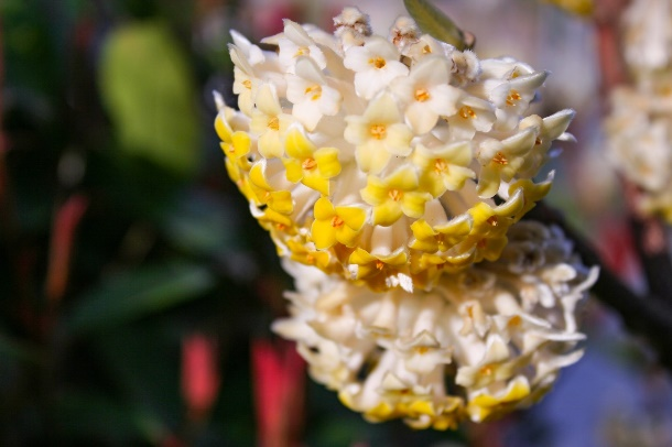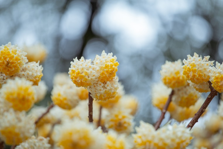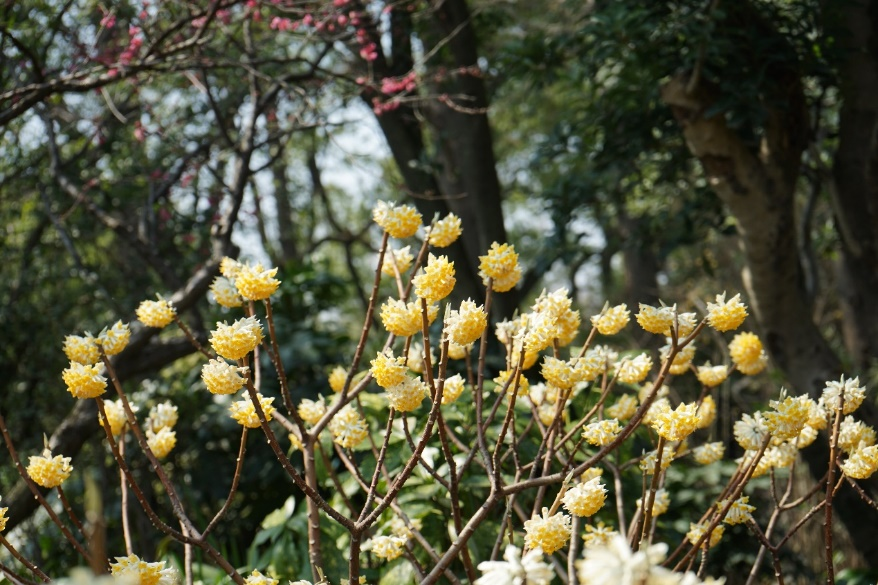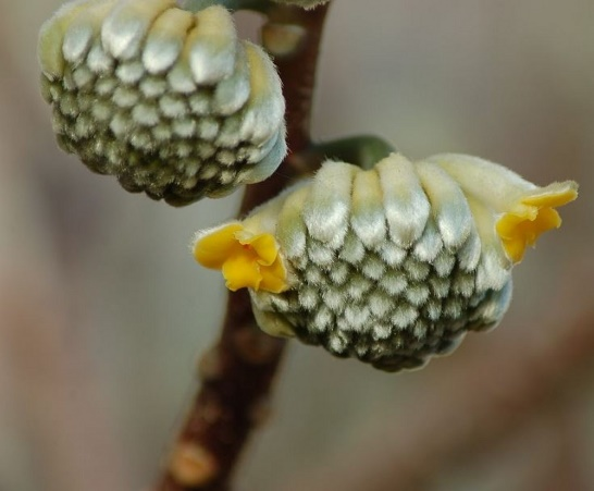 <svg viewbox="0 0 1 1" style="float:left;line-height:0;width:0;vertical-align:top;" role="img" aria-label="插图"></svg><svg viewbox="0 0 1 1" style="float:left;line-height:0;width:0;vertical-align:top;" role="img" aria-label="插图"></svg><svg viewbox="0 0 1 1" style="float:left;line-height:0;width:0;vertical-align:top;" role="img" aria-label="插图"></svg><svg viewbox="0 0 1 1" style="float:left;line-height:0;width:0;vertical-align:top;" role="img" aria-label="插图"></svg><svg viewbox="0 0 1 1" style="float:left;line-height:0;width:0;vertical-align:top;" role="img" aria-label="插图"></svg>最近,你在绿化带或公厕周边,见过一种长着金黄色“莲蓬头”的有趣的灌木吗?路过这些“莲蓬头”时,我们时常会感受到一阵扑面而来的浓郁甜香。也许你听说过这种植物叫结香Edgeworthia chrysantha 。它们在长江流域以南较为常见,上海的绿化带里就有很多,密集丛生的枝条不到一人高,光秃秃的枝梢上挂着一个个黄色花球,是一种花叶不相见的奇特植物。它的“香”当然不言而喻,那么你是否想过“结”又代表什么呢?或许你未曾留意过结香夏季时的样子,因为在那时它看上去不过是一丛普普通通的大灌木罢了。粗壮的枝条通常三叉分支,形成茂密而规整的灌丛,狭长柔软的叶子集中在枝条上部。到了初秋,枝条顶端悄然出现嫩绿的花芽,藏在叶丛中。在万物萧索的深冬,结香落尽叶子,只剩下一个个银白色的“小灯笼”挂在棕红色的枝头,等待一夜春风将它们唤醒。来源:farmyardnurseries.co.uk初春,结香的花芽吐出金黄色的花朵,头状花序由30-50朵小花组成,完全开放时花序呈半球形,像挂在树梢上的蜂窝。结香的花朵没有花瓣,由花萼特化成管状的花冠,因此若仔细观察结香的小花,可以发现最外层并没有绿色的花萼。在花冠的外侧,覆盖着花芽阶段保留的柔毛,顶端是4枚排列成十字形的肉质裂片,裂片内侧在花朵初开时呈深黄色,慢慢变为乳白色。由于花序上的小花从外向内依次绽放,因此可以在同一花序上看到微妙的渐变色。雄蕊位于管状花冠的开口处,不太显眼。结香盛开的花朵可释放大量挥发性的酯类和少量醛酮类化合物,其强烈的香气对于春寒中饥肠辘辘的传粉昆虫来说,无疑是餐厅的吆喝,但由于管状花很长,所以只有长着较长口器的昆虫才能更方便地享用结香的精华,比如经常冒充蜂鸟的长喙天蛾。对于人类来说,结香花也有提取芳香精油的潜力。城市中种植的结香似乎不怎么结果,当枝条的顶芽开始舒展叶片时,变成乳白色的小花就零落一地了。除了黄色花的原种,园艺师还选育了一个深红色花的品种,被称为‘红龙’结香E. chrysantha 'Red Dragon',不过这个品种在国内似乎没有引进或并不常见。‘红龙’结香 | 来源:dreamstime.com说完了“香”,那么我们来看看“结”指的是什么。虽然结香的枝条看上去比较粗,还有许多麻麻赖赖的叶痕,但实际上非常柔韧,还能够打结!这是因为它的树皮中有着大量强韧而柔软的韧皮纤维,木质部也很柔韧,不易折断。相传,在结香树上打结有着非凡的寓意。清晨从睡梦中苏醒后,用结香树枝条打个结,既能招来好运,让甜美的梦境化为现实,又可驱散噩梦阴霾;心怀期许,在结香树上打结许愿,心愿便有望达成。不过大家赏花的时候还是点到为止为好,稍微弯曲一下枝条,感受一下它的柔韧性就够了,如果人人都去打结的话,就有破坏绿化的嫌疑了。这样的枝条可不止能用来打结,还有其他妙用。纸张的主要原料是植物纤维(纤维素)。对于用来书写、打印或清洁的普通纸张来说,易于大量获取的木材和竹子、芦苇、麦秆等材料就足够了。但高级的书画用纸及需要经常流通周转的纸币等特殊用纸,对于纸张的强度和耐久度有很高的要求,需要用到一些性能更佳的植物纤维,如棉花(人民币纸张的原料之一)、麻类,还有桑树、构树和青檀(宣纸的重要原料)的树皮等,而结香的树皮正是其中的佼佼者。它们的纤维较长,细密柔韧且有光泽,日本2024年7月发行的新版纸币就以结香树皮作为主要原料之一。结香枝条剥取树皮后剩下的木质芯,也是编筐编篓的好材料。在浙南山区,结香作为经济植物种植已有30余年,收获的树皮和茎杆为当地提供了可观的收入。结香属于瑞香科 Thymelaeaceae 植物,这个科并不算大,结香应该是其中最常见,最为人熟知的物种了。瑞香科的很多物种都像结香一样有着芳香的花朵和柔韧的枝条。<svg viewbox="0 0 1 1" style="float:left;line-height:0;width:0;vertical-align:top;" role="img" aria-label="插图"></svg>除了结香外,我们最常见到的种类或许是瑞香 Daphne odora 的变种金边瑞香 D. odora f. marginata 。金边瑞香的株形相对矮小,由于花期在冬春,它们经常会作为盆栽出现在年宵花集市上。和结香一样,金边瑞香的花也很香,枝条同样具有柔韧的特质。<svg viewbox="0 0 1 1" style="float:left;line-height:0;width:0;vertical-align:top;" role="img" aria-label="插图"></svg>云南丽江古城有一项自唐代就已经成型的非遗产品——东巴纸,据说可以保存千年。东巴纸是以瑞香科荛花属 Wikstroemia 植物的树皮为原料,去除外皮(木栓层)后经过蒸煮、捶打、抄纸和晾干等工艺制成的。和在日本用于生产纸币的结香树皮一样,荛花的树皮也含有大量长而柔韧的韧皮纤维,因此东巴纸的质地非常坚韧,遇水不破。又因为荛花有一定“毒性”,所以制成的纸张不受虫蛀,易于长期保存。作为东巴纸原料的丽江荛花 W. lichiangensis <svg viewbox="0 0 1 1" style="f