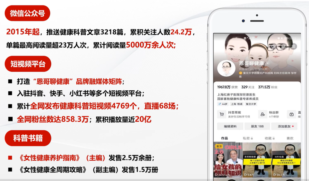 在医学的殿堂里,有这样一位医生,他不仅在临床一线救死扶伤,更在网络世界中播撒健康的种子,他就是复旦大学附属妇产科医院妇科内分泌科副主任邹世恩。十年如一日,他以“恩哥聊健康”为名,用科普之光照亮了无数女性的健康之路,凭借卓越科普贡献荣获2024年创新奖科普贡献奖(个人)一等奖。 初心如磐,科普启航 2015年,邹世恩主任创立了“恩哥聊健康”微信公众号,这标志着他科普事业的正式启航。从微信公众号到抖音、快手、小红书,他紧跟时代步伐,不断拓展科普阵地,用图文、短视频、直播等多种形式,将专业的医学知识转化为通俗易懂的语言,让健康知识触手可及。 内容丰富,全面覆盖 邹主任的科普内容广泛而深入,涵盖了妇产科常见疾病、生殖内分泌健康、肿瘤防治、孕产知识及健康生活等多个方面。他不仅讲解“硬核”医学知识,更注重传递“柔性”健康理念,鼓励女性关爱自我,提升自我健康意识。他的作品,既有科学的严谨,又不失人文的关怀,深受女性朋友的喜爱。 创新模式,高效传播 为了提升科普效果,邹主任创新性地建立了“创作”与“审核”两大团队。创作团队运用传播学经典理论,精心策划每一篇科普内容;审核团队则由资深医生组成,确保所有信息的科学性、前沿性和权威性。这种双团队模式,让“恩哥聊健康”的科普作品既接地气又具影响力。 十年来,“恩哥聊健康”品牌影响力日益扩大,微信公众号粉丝数突破24万,短视频平台粉丝总数超900万。邹主任的科普作品累计阅读量、点赞数均达数千万,主编的科普书籍销售量突破三万册。他先后荣获多项荣誉,包括上海市健康科普杰出人物等,成为医学界科普的标杆人物。 医者仁心,科普为民 邹世恩主任深知,科普不仅是医疗的延伸,更是医务人员的社会责任。他用自己的行动诠释了“大医精诚”的精神,通过科普工作,提高了公众的健康意识,为构建健康中国贡献了自己的力量。 十年科普路,邹世恩主任用爱心和智慧守护着女性的健康。未来,他将继续在科普的道路上砥砺前行,让更多的女性受益,让健康之光照亮每一个角落。