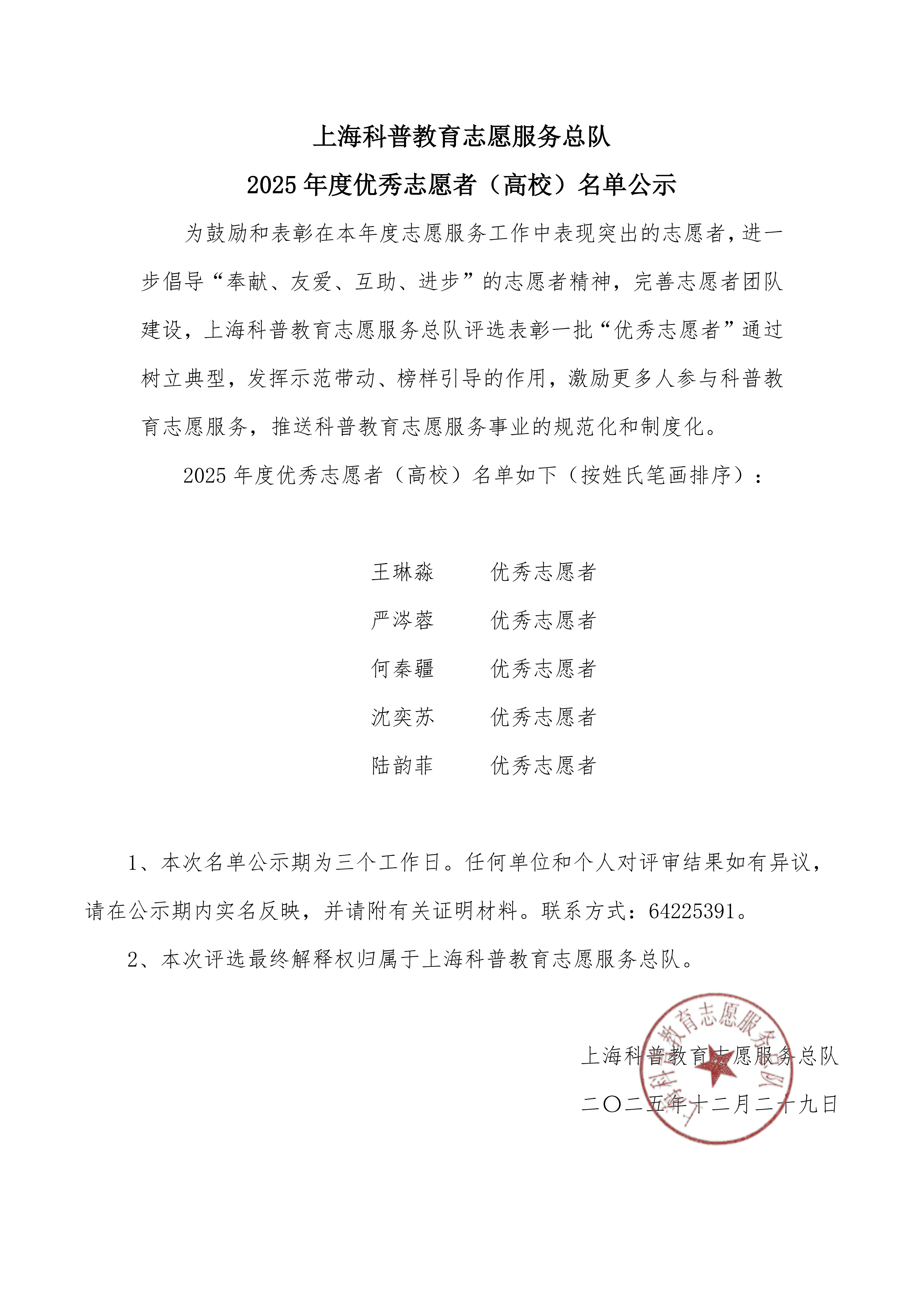 上海科普教育志愿服务总队2025年度优秀志愿者(高校) 名单公示