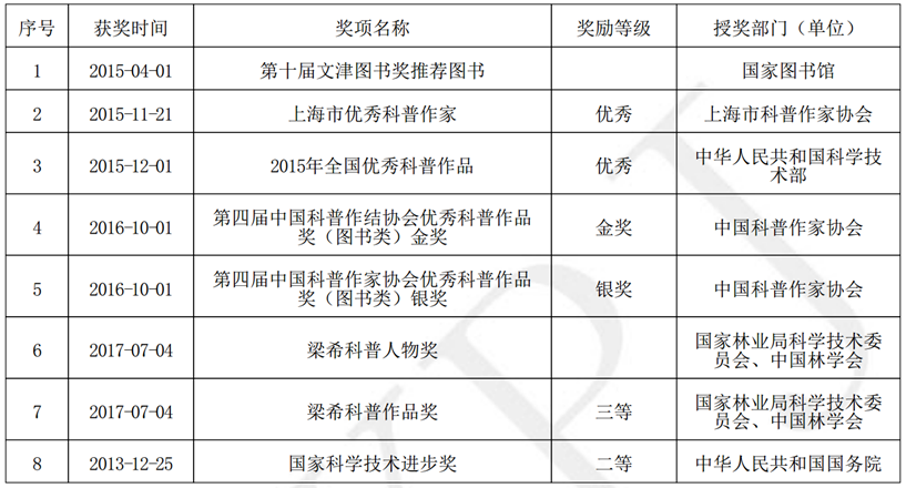 2015年以来,截至报奖时为止,已翻译生物系列科普图书6部,原创1部 。2018年报奖之后,又出版翻译作品2部 ,引介国外优秀科普作品,总结国际先进科普经验。