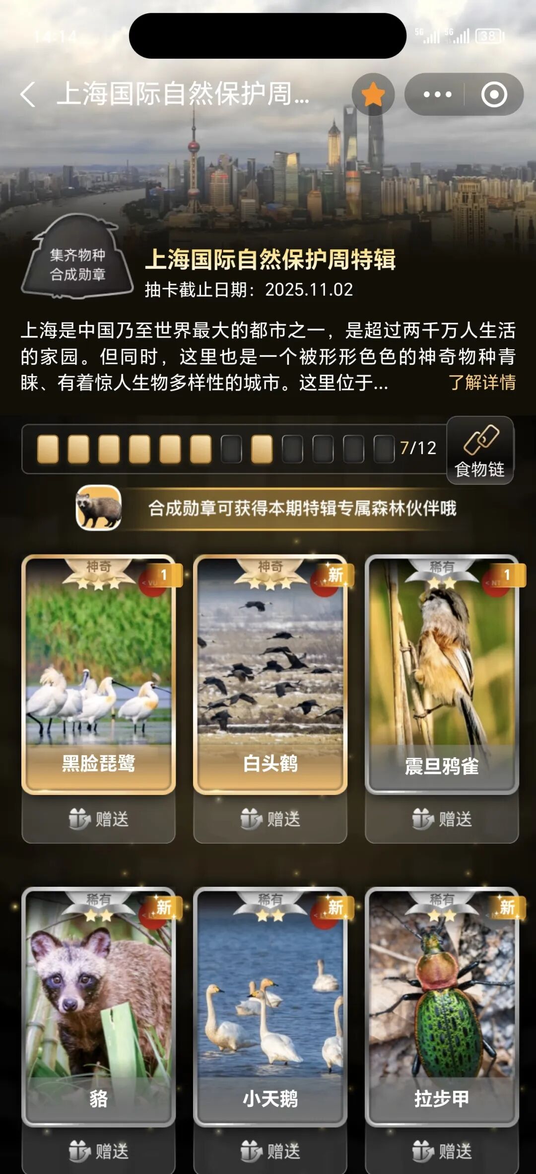 <svg viewbox="0 0 1 1" style="float:left;line-height:0;width:0;vertical-align:top;" role="img" aria-label="插图"></svg><svg viewbox="0 0 1 1" style="float:left;line-height:0;width:0;vertical-align:top;" role="img" aria-label="插图"></svg><svg viewbox="0 0 1 1" style="float:left;line-height:0;width:0;vertical-align:top;" role="img" aria-label="插图"></svg><svg viewbox="0 0 1 1" style="float:left;line-height:0;width:0;vertical-align:top;" role="img" aria-label="插图"></svg><svg viewbox="0 0 1 1" style="float:left;line-height:0;width:0;vertical-align:top;" role="img" aria-label="插图"></svg><svg viewbox="0 0 1 1" style="float:left;line-height:0;width:0;vertical-align:top;" role="img" aria-label="插图"></svg>集齐 13张 即可获取“上海国际自然保护周特辑”图鉴勋章。