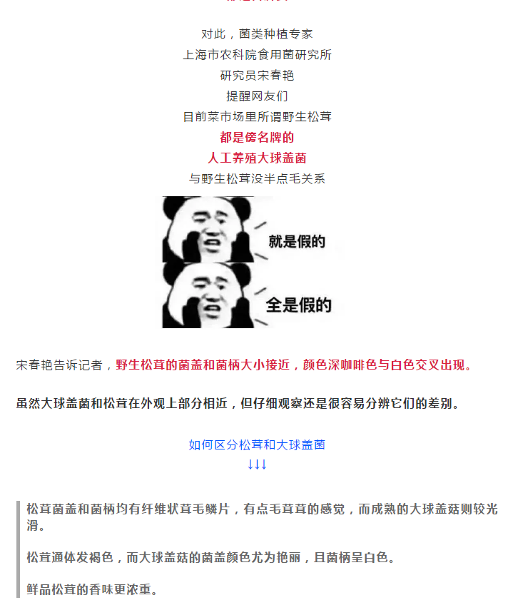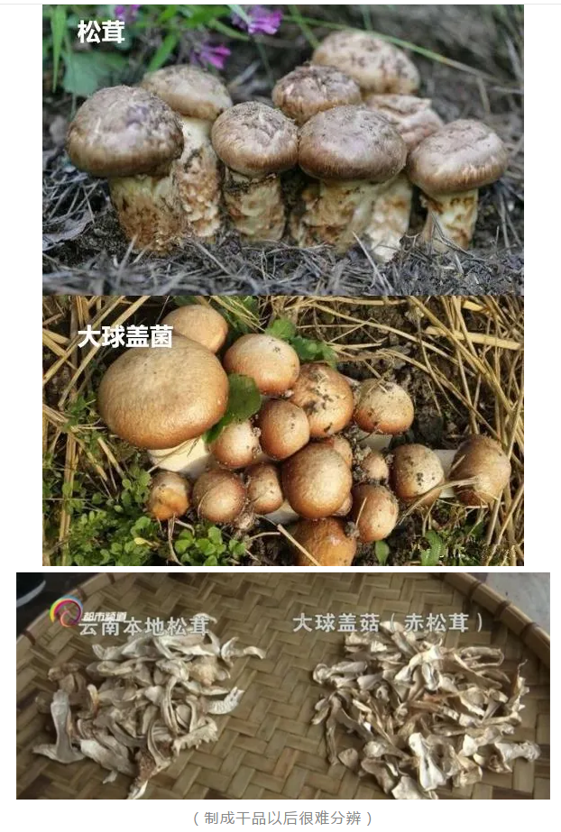 而大球盖菌,学名叫皱环球盖菇,由于外形有点像松茸,因此很多栽培户傍名牌将其冠为赤松茸、红松茸。为了更容易出手,部分栽培户、销售商索性直截了当称其为“松茸”,更有甚者称其为“野生松茸”。