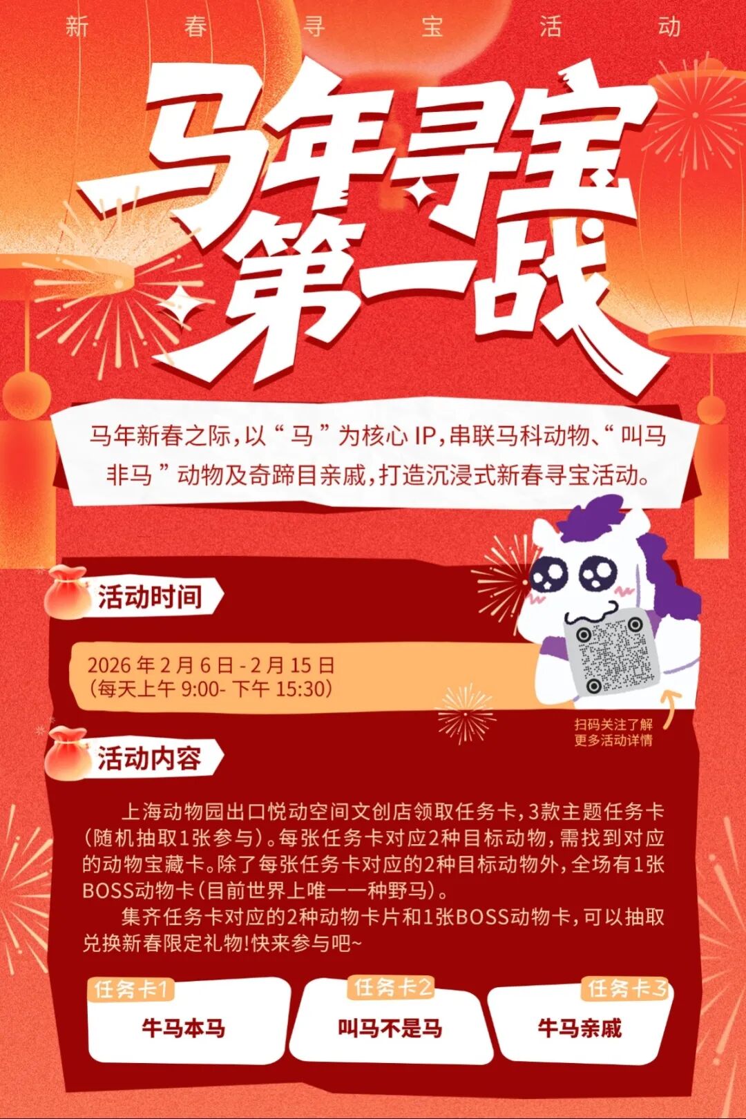马年新春之际,以“马”为核心IP,串联马科动物、“叫马非马”动物及奇蹄目亲戚,打造沉浸式新春寻宝活动。让我们在新年氛围中探索动物分类奥秘,了解普氏野马等7种动物的外形特征、生活习性及保护现状,增进对“马系”动物的认知,同时通过互动体验,传递团圆喜庆的新春祝福,提升动物园新春游览的参与感与趣味性。 2026年2月6日-2月15日(每天上午9:00-下午15:30) 上海动物园 第一步:上海动物园出口悦动空间内领取活动道具 领取活动道具,启动寻宝游戏! 活动道具包括:1份《马年寻宝第一战,发现“马系”动物》寻宝任务卡(任务卡共3种,随机抽取1张参与)。 第二步:上海动物园内寻找动物宝藏卡片 根据任务卡线索寻找宝藏卡片! 每张任务卡对应2种目标动物,需找到对应的动物宝藏卡(卡片印有动物照片及新春祝福),除了每张任务卡对应的2种目标动物外,全场有1种BOSS动物卡。 第三步:集齐1组动物卡,店内抽取兑换礼物 集齐相应卡片,抽取兑换惊喜好礼! 集齐任务卡对应的2种动物卡片和1张BOSS动物卡,可以抽取兑换新春限定礼物。 寻宝抽奖截止时间:2026年2月15日17:00 在寻宝的过程中,请遵守上海动物园的规定,爱护动物和环境。 在充满希望与欢乐的新春佳节,期待您的到来,和小动物们一起解密这场神奇的寻宝之旅。让我们相约上海动物园,共同探索奇妙的“马系”动物世界!